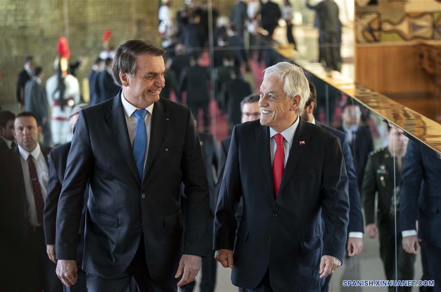 Imagen cedida por la Presidencia de Chile, del presidente brasile?o, Jair Bolsonaro (i), reuniéndose con el presidente chileno, Sebastián Pi?era (d), en Brasilia, Brasil, el 28 de agosto de 2019. Los presidentes de Brasil, Jair Bolsonaro, y de Chile, Sebastián Pi?era, quienes el miércoles se reunieron en Brasilia, expresaron en forma conjunta que los "desafíos ambientales" deben enfrentarse con respeto a la soberanía. (Xinhua/Marcelo Segura/Presidencia de Chile)