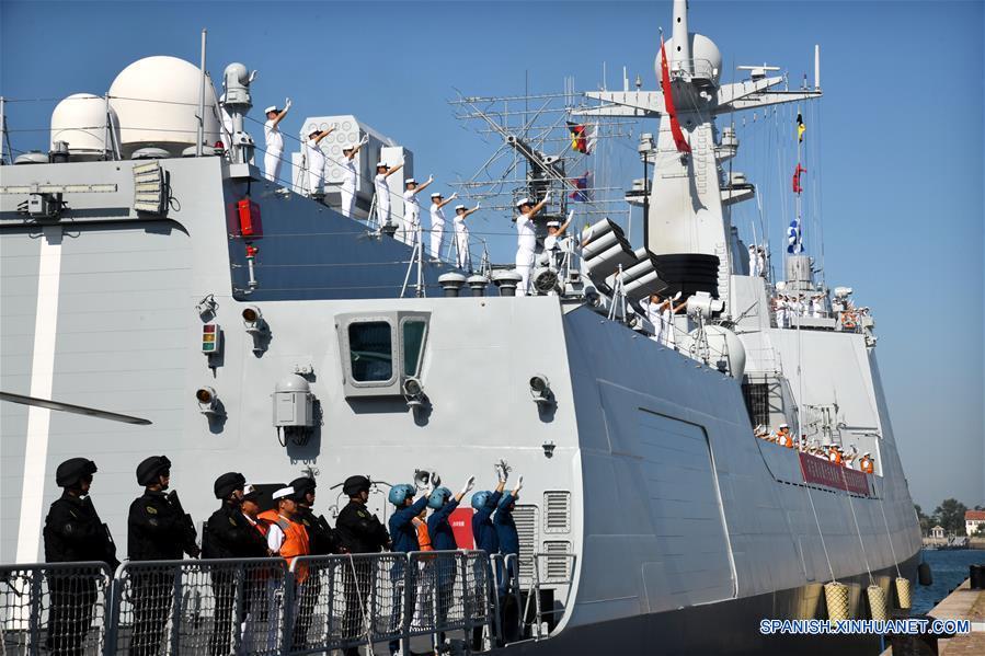 SHANDONG, 29 agosto, 2019 (Xinhua) -- Soldados se despiden de sus familiares y amigos a bordo del destructor Xining en un puerto, en Qingdao, provincia de Shandong, en el este de China, el 29 de agosto de 2019. La 33 flota de la Armada del Ejército Popular de Liberación (EPL) de China zarpó el jueves de la ciudad portuaria de Qingdao en la provincia de Shandong, este de China, rumbo al golfo de Adén para escoltar a embarcaciones civiles. (Xinhua/Li Ziheng)
