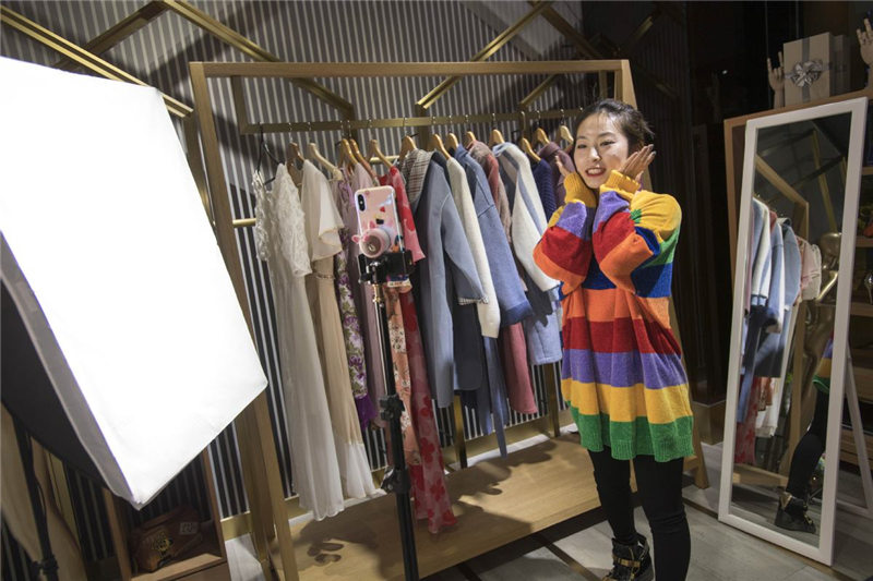 La due?a de una tienda de vestidos promueve su mercancía a través de una transmisión en vivo en Wuhan, provincia de Hubei. [Foto: Xinhua]