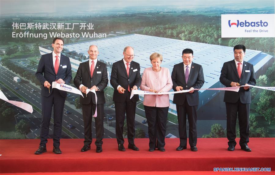 La canciller alemana, Angela Merkel, asiste a la ceremonia de inauguración de una fábrica del proveedor de autopartes alemán Webasto, en Wuhan, ciudad capital de la provincia de Hubei, en el centro de China, el 7 de septiembre de 2019. La canciller alemana, Angela Merkel, visitó Wuhan el sábado. (Xinhua/Xiao Yijiu)