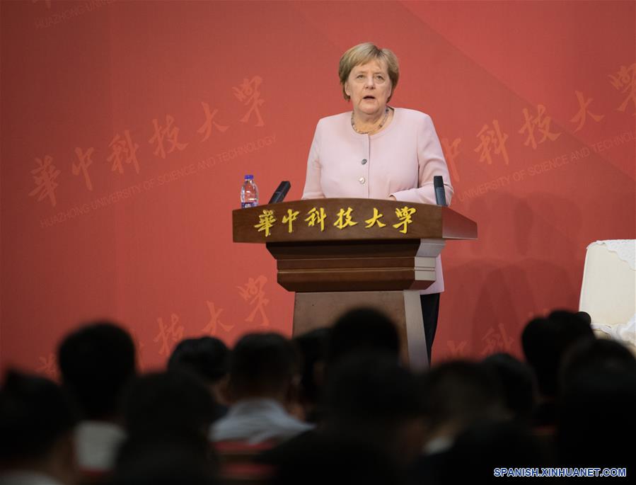 Al hablar con estudiantes de la Universidad de Ciencia y Tecnología de Huazhong, Merkel subrayó la importancia de la cooperación internacional en la era de la globalización, y pidió a los estudiantes ser participantes.