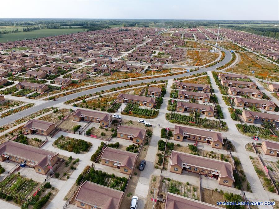 XINJIANG, 7 septiembre, 2019 (Xinhua) -- Imagen del 19 de agosto de 2019 de una vista aérea de un sitio de reubicación, en el distrito de Yecheng de Kashgar, en la región autónoma de Uygur de Xinjiang, en el noroeste de China. Para cumplir con la misión de erradicar la pobreza absoluta para el a?o 2020, Xinjiang ha estado ayudando a los agricultores y pastores pobres a mudarse de las regiones monta?osas y el interior del desierto para restablecerse en llanuras y oasis. A finales de 2018, un total de 140.000 personas afectadas por la pobreza en la región fueron reubicadas. Otras 21.000 serán reubicadas en 2019. (Xinhua/Ding Lei)