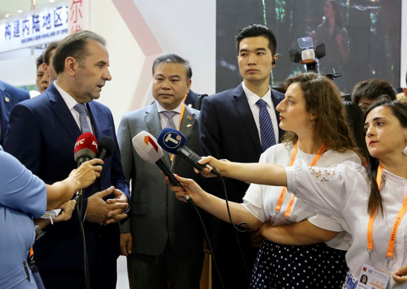 El viceprimer ministro de Serbia, Rasim Ljajic, responde a las preguntas de los periodistas en la ceremonia de inauguración de la Feria Internacional de Inversión y Comercio de China de 2019 en Xiamen, provincia de Fujian, el domingo. [Foto de Hu Meidong / China Daily]