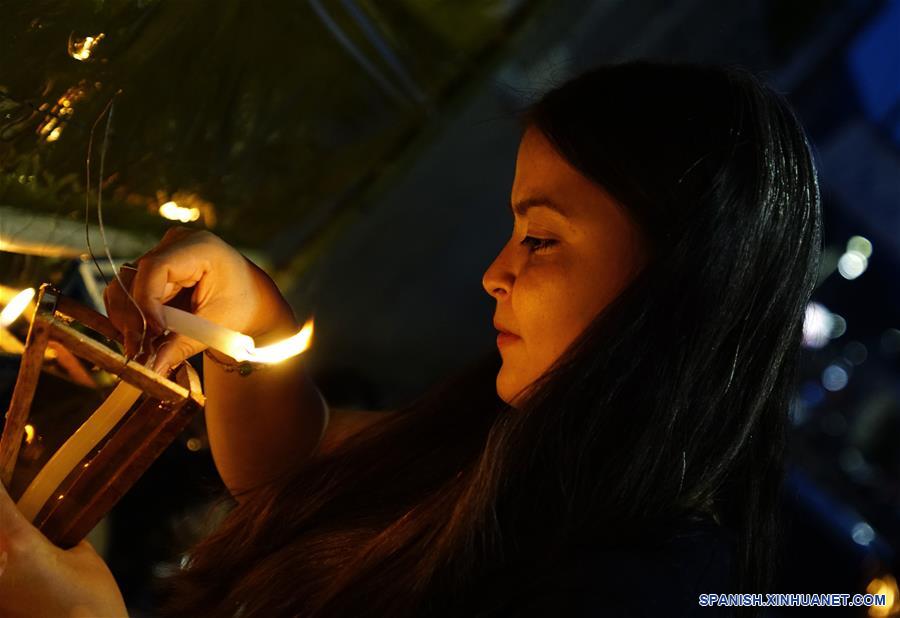 AHUACHAPAN, septiembre 8, 2019 (Xinhua) -- Imagen del 7 de septiembre de 2019 de una joven encendiendo una vela durante el Festival de los Farolitos, en Ahuachapán, El Salvador. Cada 7 de septiembre estructuras de madera y papel de diversos colores cubren una vela encendida para conmemorar el terremoto de 1850, cuando los pobladores tuvieron que encender rajas secas de ocote para iluminarse mientras dormían y desde ese entonces se lleva a cabo el Festival de Los Farolitos, decretado Patrimonio Cultural Inmaterial por el Congreso salvadore?o en 2014. (Xinhua/Alexander Pe?a)