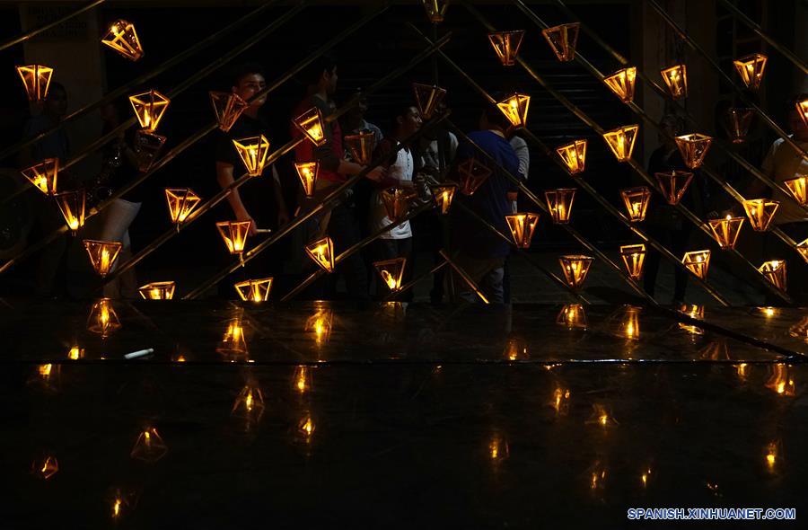 AHUACHAPAN, septiembre 8, 2019 (Xinhua) -- Imagen del 7 de septiembre de 2019 de personas participando en el Festival de los Farolitos, en Ahuachapán, El Salvador. Cada 7 de septiembre estructuras de madera y papel de diversos colores cubren una vela encendida para conmemorar el terremoto de 1850, cuando los pobladores tuvieron que encender rajas secas de ocote para iluminarse mientras dormían y desde ese entonces se lleva a cabo el Festival de Los Farolitos, decretado Patrimonio Cultural Inmaterial por el Congreso salvadore?o en 2014. (Xinhua/Alexander Pe?a)