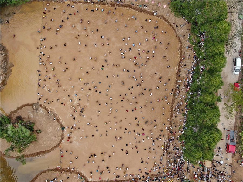 Una foto aérea de visitantes capturando peces durante el “Shaiqiu” que se celebra en Fuling, Chongqing, el 7 de septiembre del 2019. (Foto: chinadaily.com.cn)