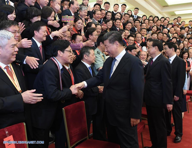 El presidente chino, Xi Jinping, también secretario general del Comité Central del Partido Comunista de China (PCCh) y presidente de la Comisión Militar Central, se reúne con representantes de unidades e individuos de excelencia en el ámbito educativo, en el Gran Palacio del Pueblo, en Beijing, capital de China, el 10 de septiembre de 2019, extendiendo saludos con motivo del Día del Maestro a los docentes y trabajadores del sector de todo el país. También estuvieron presentes el primer ministro, Li Keqiang, y Wang Huning, miembro del Secretariado del Comité Central del PCCh, ambos miembros del Comité Permanente del Buró Político del Comité Central del PCCh. (Xinhua/Shen Hong)