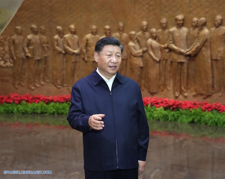 El presidente chino, Xi Jinping, también secretario general del Comité Central del Partido Comunista de China (PCCh) y presidente de la Comisión Militar Central, pronuncia un discurso mientras visita una exposición sobre la historia del Comité Central del PCCh, observando documentales y reviviendo la historia de cómo el Comité Central del PCCh se trasladó a Beijing en 1949, en un museo conmemorativo revolucionario en las Colinas Fragantes, en Beijing, capital de China, el 12 de septiembre de 2019. Xi visitó un monumento conmemorativo revolucionario en las Colinas Fragantes en los suburbios de Beijing el jueves. (Xinhua/Huang Jingwen)