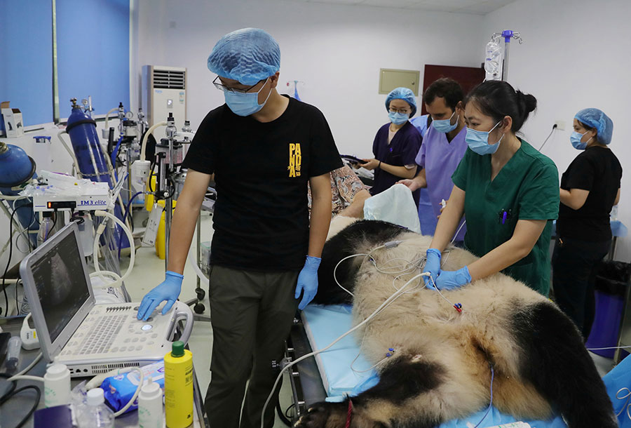 Expertos nacionales y extranjeros examinan los dientes de un panda gigante en la Base de Investigación de Cría de Panda Gigante de Chengdu, provincia de Sichuan, 3 de septiembre del 2019. Los especialistas han concebido una investigación dental a fondo a los panda gigantes. Este es el primer programa sistemático para verificar la salud dental de los pandas. (Foto: chinadaily)