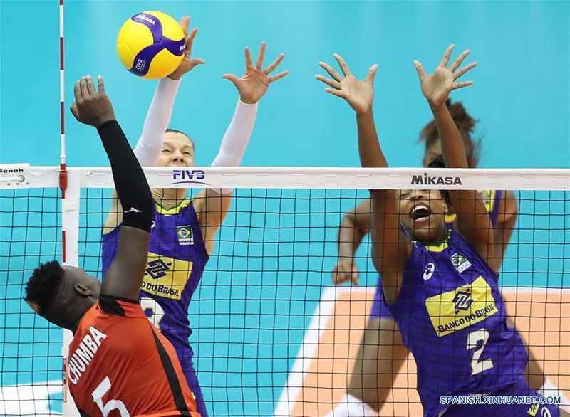 HAMAMATSU, 18 septiembre, 2019 (Xinhua) -- Mercy Moim (arriba), de Kenia, clava el balón durante el partido de round-robin (todos contra todos) de la Copa Mundial Femenina de la Federación Internacional de Voleibol (FIVB) 2019, ante Brasil, celebrado en Hamamatsu, Japón, el 18 de septiembre de 2019. (Xinhua/Du Xiaoyi)