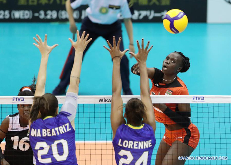 HAMAMATSU, 18 septiembre, 2019 (Xinhua) -- Mercy Moim (arriba), de Kenia, clava el balón durante el partido de round-robin (todos contra todos) de la Copa Mundial Femenina de la Federación Internacional de Voleibol (FIVB) 2019, ante Brasil, celebrado en Hamamatsu, Japón, el 18 de septiembre de 2019. (Xinhua/Du Xiaoyi)