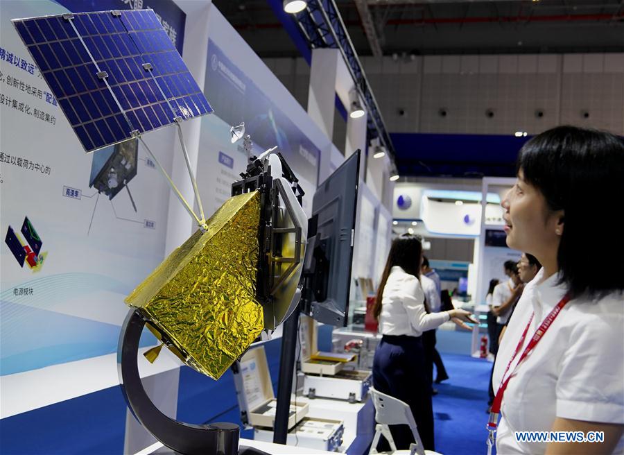 Shanghai, 19/09/2019 (El Pueblo en Línea) - Un visitante aprecia un modelo del satélite Fengyun-4 durante la Feria Internacional Industrial China 2019, que se celebra del 17 al 21 de septiembre y cuenta con más de 2.600 expositores provenientes de 27 países y regiones, 17 de septiembre del 2019. (Xinhua / Zhang Jiansong)