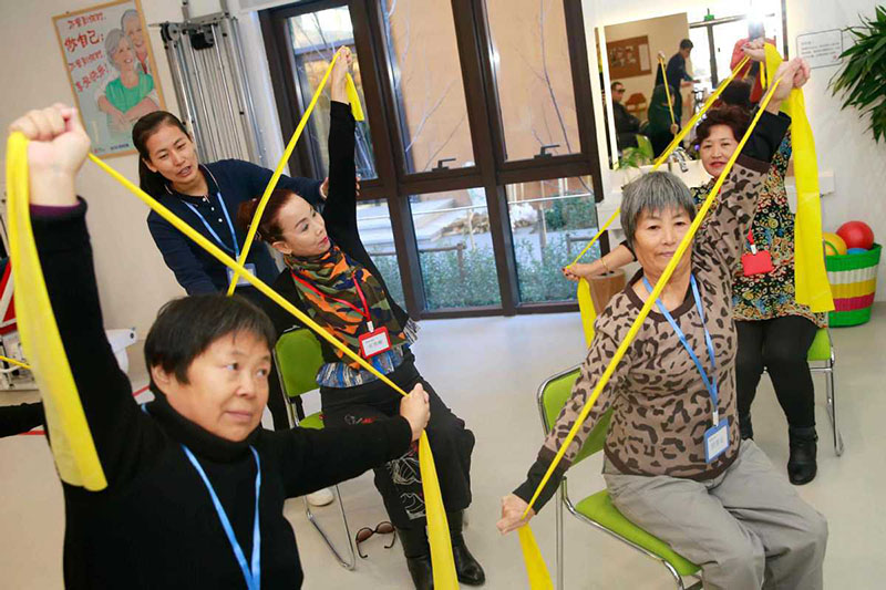 Un entrenador ense?a a las personas mayores cómo hacer ejercicio en un centro de rehabilitación en Tianjin. [Foto por Jia Chenglong / para China Daily]