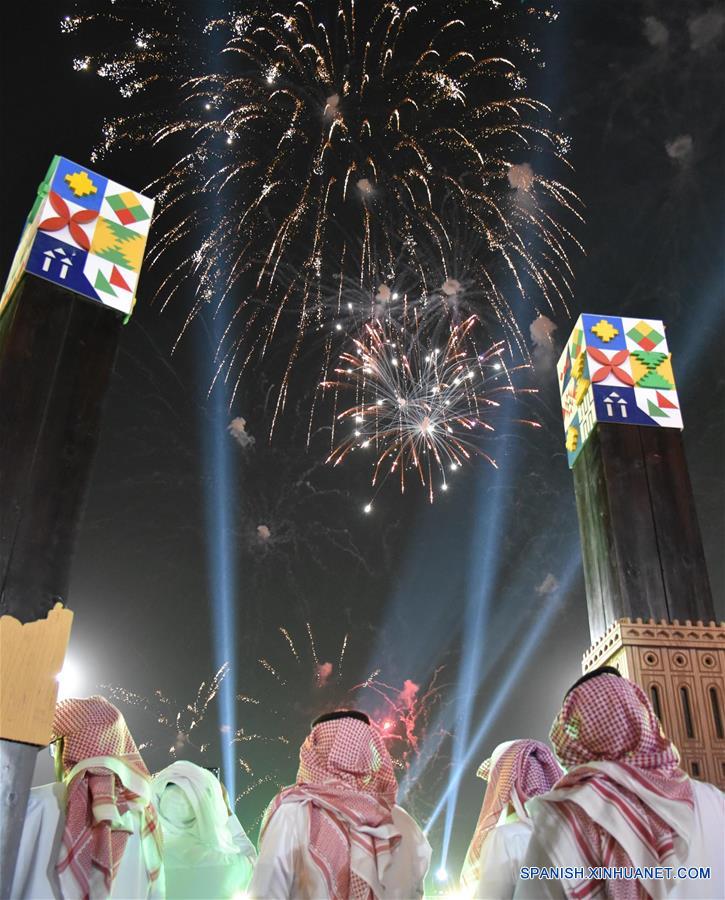 TABUK, 23 septiembre, 2019 (Xinhua) -- Personas observan un espectáculo de fuegos artificiales con motivo del Día Nacional, en Tabuk, en el noroeste de Arabia Saudí, el 23 de septiembre de 2019. Anualmente, Arabia Saudí celebra su Día Nacional el 23 de septiembre. (Xinhua/Tu Yifan)