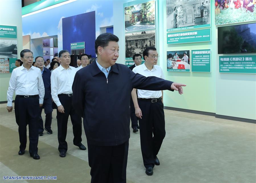 El presidente chino, Xi Jinping, también secretario general del Comité Central del Partido Comunista de China y presidente de la Comisión Militar Central, visita una exhibición de los logros en conmemoración del 70o aniversario de la fundación de la República Popular China, en el Centro de Exposiciones de Beijing, en Beijing, capital de China, el 23 de septiembre de 2019. Los altos funcionarios Li Keqiang, Wang Yang, Wang Huning, Zhao Leji, Han Zheng y Wang Qishan también visitaron la exhibición. (Xinhua/Ju Peng)