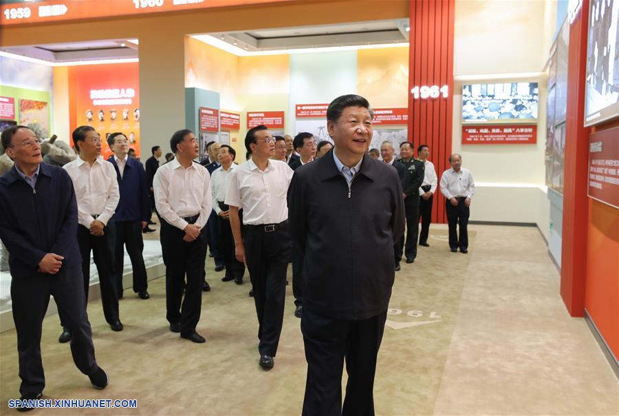 El presidente chino, Xi Jinping, también secretario general del Comité Central del Partido Comunista de China y presidente de la Comisión Militar Central, visita una exhibición de los logros en conmemoración del 70o aniversario de la fundación de la República Popular China, en el Centro de Exposiciones de Beijing, en Beijing, capital de China, el 23 de septiembre de 2019. Los altos funcionarios Li Keqiang, Wang Yang, Wang Huning, Zhao Leji, Han Zheng y Wang Qishan también visitaron la exhibición. (Xinhua/Ju Peng)