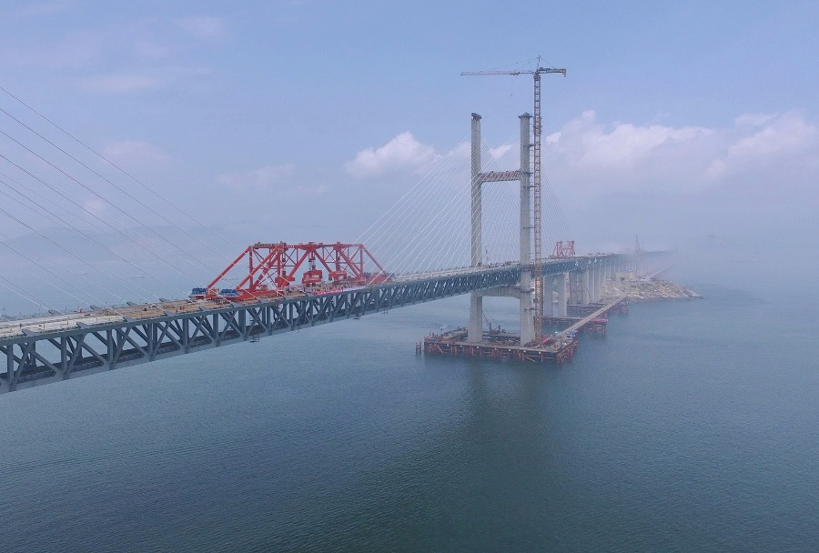 La última viga de acero, con un peso de 473 toneladas, fue atornillada el miércoles por la ma?ana en el puente de ferrocarril y carretera del estrecho de Pingtan, otro de los megaproyectos de China.