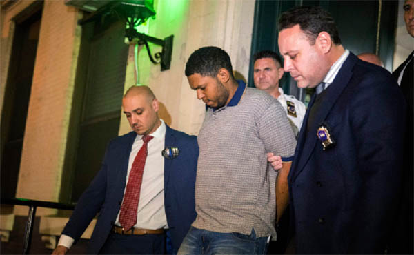 Los oficiales de policía escoltan a Randy Santos hasta un vehículo con destino a un hospital para la recolección de pruebas el sábado en Nueva York. Santos fue acusado de asesinar a cuatro hombres sin hogar mientras dormían. [Foto / Agencias]