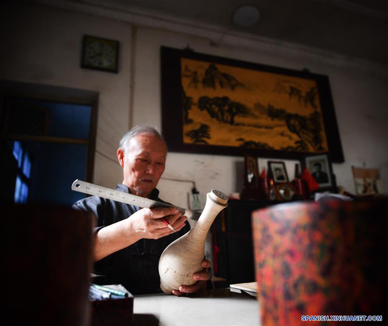 POYANG, 13 octubre, 2019 (Xinhua) -- Imagen del 12 de octubre de 2019 de Ding Guokun, en su hogar, mostrando su trabajo favorito, en el distrito de Poyang, en la provincia de Jiangxi, en el este de China. Ding Guokun, de 76 a?os de edad, heredero nacional del patrimonio cultural intangible, ha venido haciendo lacado sin cuerpo desde que tenía 16 a?os. "Sigue haciendo una cosa que hagas bien. Eventualmente te ganarás el reconocimiento de la gente." (Xinhua/Hu Chenhuan)
