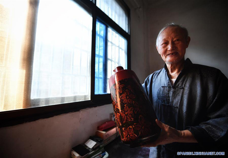 POYANG, 13 octubre, 2019 (Xinhua) -- Imagen del 12 de octubre de 2019 de Ding Guokun, en su hogar, mostrando su trabajo favorito, en el distrito de Poyang, en la provincia de Jiangxi, en el este de China. Ding Guokun, de 76 a?os de edad, heredero nacional del patrimonio cultural intangible, ha venido haciendo lacado sin cuerpo desde que tenía 16 a?os. "Sigue haciendo una cosa que hagas bien. Eventualmente te ganarás el reconocimiento de la gente." (Xinhua/Hu Chenhuan)