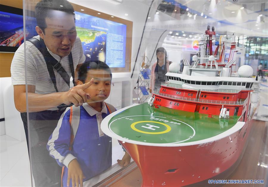 SHENZHEN, 15 octubre, 2019 (Xinhua) -- Visitantes observan un modelo a escala del buque de ingeniería de aguas profundas en el estand de China National Offshore Oil Corporation en la Exposición de Economía Marítima de China 2019, en Shenzhen, en la provincia de Guangdong, en el sur de China, el 15 de octubre de 2019. La exposición, con el tema "Compartir oportunidades de la economía azul, construyendo un futuro compartido", cuenta con la participación de más de 450 compa?ías e instituciones y se espera que presente los logros de China en la economía marítima y los últimos avances en la industria marítima global. (Xinhua/Mao Siqian)