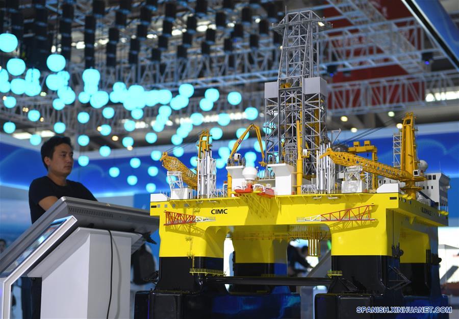 SHENZHEN, 15 octubre, 2019 (Xinhua) -- Un visitante observa un modelo a escala de una plataforma petrolera en la Exposición de Economía Marítima de China 2019, en Shenzhen, en la provincia de Guangdong, en el sur de China, el 15 de octubre de 2019. La exposición, con el tema "Compartir oportunidades de la economía azul, construyendo un futuro compartido", cuenta con la participación de más de 450 compa?ías e instituciones y se espera que presente los logros de China en la economía marítima y los últimos avances en la industria marítima global. (Xinhua/Mao Siqian)