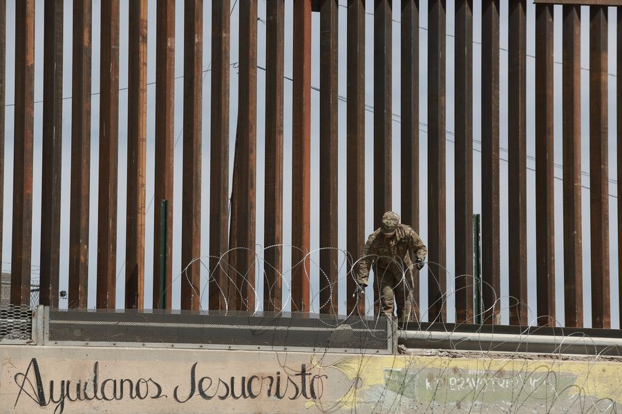 Un soldado estadounidense coloca alambre de púas en el muro de la frontera sur de EEUU, visto desde Ciudad Juárez, México, el 4 de abril de 2019. (Xinhua/Christian Torres)