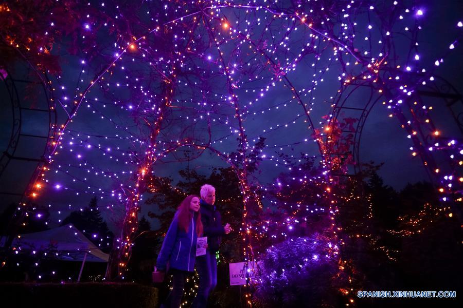 VANCOUVER, 17 octubre, 2019 (Xinhua) -- Imagen del 16 de octubre de 2019 de personas observando las muestras de iluminación mientras asisten al evento temático de Halloween "Resplandor en el Jardín" en el Jardín VanDusen, en Vancouver, Canadá. (Xinhua/Liang Sen)