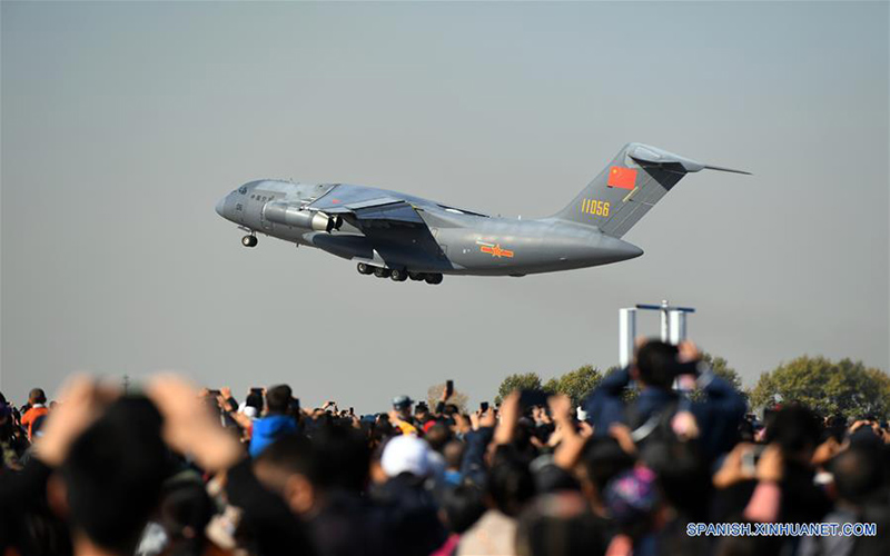 CHANGCHUN, 17 octubre, 2019 (Xinhua) -- Un avión de transporte Y-20 realiza una demostración de vuelo durante una actividad en celebración del 70° aniversario de la fundación de la fuerza Aérea del Ejército Popular de Liberación (EPL) de China, en Changchun, capital de la provincia de Jilin, en el noreste de China, el 17 de octubre de 2019. La actividad de cinco días, donde la Fuerza Aérea del EPL exhibirá armas y equipos y ofrecerá espectáculos acrobáticos para celebrar su 70° aniversario de fundación, comenzó el jueves. Los espectadores podrán deleitarse con vuelos acrobáticos, espectáculos de paracaidistas, ejercicios de combate de cazas de tercera generación y demostraciones de fuerzas especiales aerotransportadas. Un total de 35 aviones de diez tipos harán presentaciones acrobáticas, como el caza furtivo J-20, el avión de transporte Y-20 y el caza J-16. Además de 19 aviones, la fuerza aérea seleccionó 71 equipos para la exposición estática, con el fin de demostrar su capacidad en combate aéreo, entrega estratégica, alerta y detección tempranas, apoyo de información y defensa aérea y capacidades antimisiles. (Xinhua/Lin Hong)