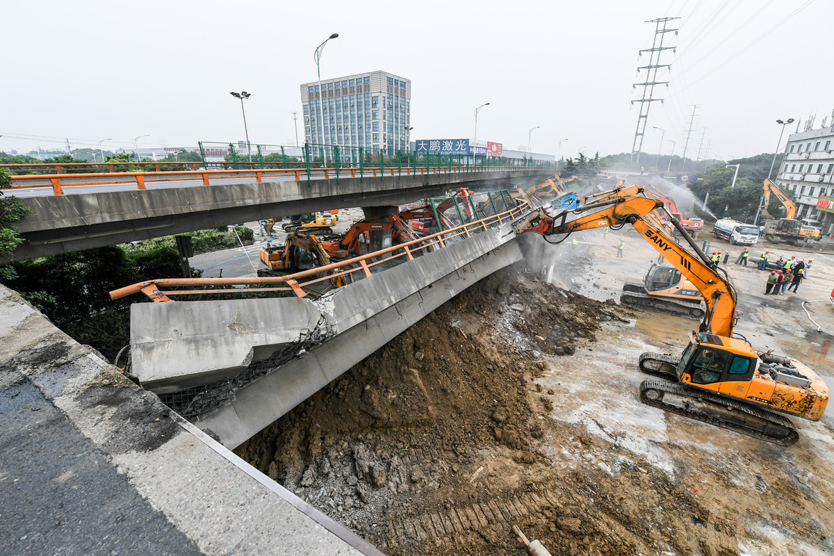 El colapso del puente superior, de 82 metros de largo y 9,5 m de ancho, ocurrió el 10 de octubre en la sección de la carretera nacional 312 en Wuxi después de que dos camiones excesivamente sobrecargados que transportaban pilas de bobinas de acero usaran el paso elevado sucesivamente.
