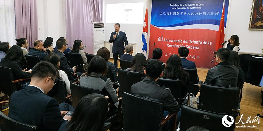 Miguel ángel Ramírez, embajador de Cuba en China, interviene durante la presentación de la XVIII Convención y Feria Internacional Informática 2020, reunió a representantes de una treintena de empresas chinas, Beijing, 24 de octubre del 2019. (Foto: YAC)