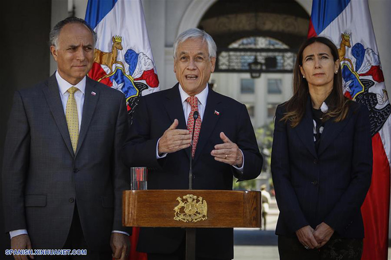 Imagen cedida por la Agencia de Noticias de Chile AGENCIAUNO del presidente chileno, Sebastián Pi?era (c), emitiendo un anuncio junto a la ministra del Medio Ambiente, Carolina Schmidt (d), y el ministro de Relaciones Exteriores, Teodoro Ribera, en el Palacio de La Moneda, en Santiago, Chile, el 30 de octubre de 2019. Pi?era anunció en un discurso que suspenderá la realización del Foro de Cooperación Económica Asia-Pacífico (APEC) y la 25 Conferencia de las Partes (COP25) de Naciones Unidas sobre Cambio Climático, que se llevarían a cabo entre noviembre y diciembre, debido a la crisis social que enfrenta el país. (Xinhua/Sebastián Beltrán Gaete/AGENCIAUNO)
