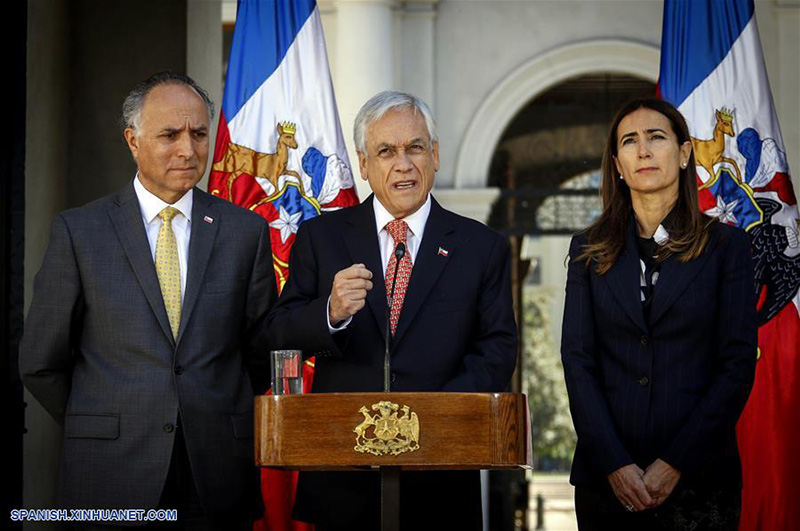 Imagen cedida por la Agencia de Noticias de Chile AGENCIAUNO del presidente chileno, Sebastián Pi?era (c), emitiendo un anuncio junto a la ministra del Medio Ambiente, Carolina Schmidt (d), y el ministro de Relaciones Exteriores, Teodoro Ribera, en el Palacio de La Moneda, en Santiago, Chile, el 30 de octubre de 2019. Pi?era anunció en un discurso que suspenderá la realización del Foro de Cooperación Económica Asia-Pacífico (APEC) y la 25 Conferencia de las Partes (COP25) de Naciones Unidas sobre Cambio Climático, que se llevarían a cabo entre noviembre y diciembre, debido a la crisis social que enfrenta el país. (Xinhua/Sebastián Beltrán Gaete/AGENCIAUNO)
