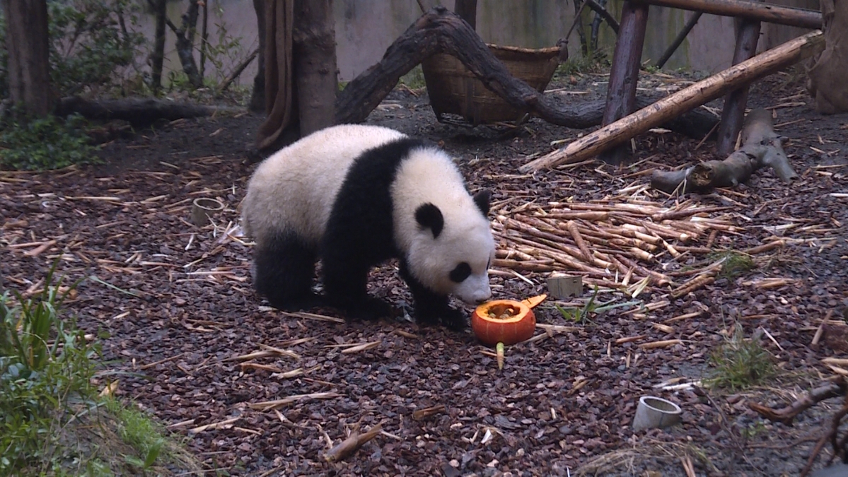 Los pandas juegan con calabazas en la Base de Investigación y Cría de Panda Gigante en Chengdu, provincia de Sichuan. (Foto: chinadaily.com.cn)