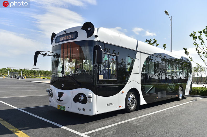 Una foto tomada el 22 de mayo de 2019 muestra un autobús de conducción autónoma multifuncional basado en inteligencia artificial con una apariencia de un panda gigante en Tianjin. [Foto / IC]