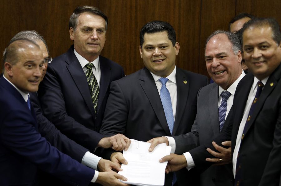 Bolsonaro entregó de manera personal al presidente del Senado, Davi Alcolumbre, quien lidera el Congreso, el paquete de reformas que el gobierno denomina Plan Más Brasil, y lo hizo en compa?ía de los ministros de Economía, Paulo Guedes, y del jefe de Gabinete, Onyx Lorenzoni.