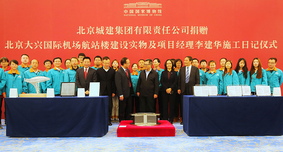 Beijing, 7/11/2019 (El Pueblo en Línea) -Beijing Urban Construction Group Co Ltd ha donado 11 objetos y 10 fotos relacionadas con la construcción del Aeropuerto Internacional Daxing de Beijing al Museo Nacional de China en Beijing el 5 de noviembre de 2019. Las 11 piezas incluyen el vidrio de malla de aluminio instalado encima del techo de la terminal, un modelo de la almohadilla de aislamiento de goma de las columnas de rodamiento y el diario del director del proyecto, Li Jianhua, acerca de la construcción del aeropuerto. [Foto por Jiang Dong / chinadaily.com.cn]