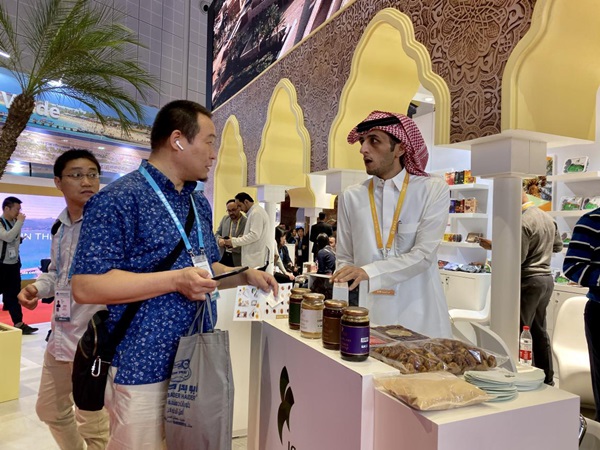 En el área de exhibiciones nacionales, un trabajador del pabellón de Arabia Saudí charla con un comprador chino. Foto por Wang Xiaobo, Diario del Pueblo