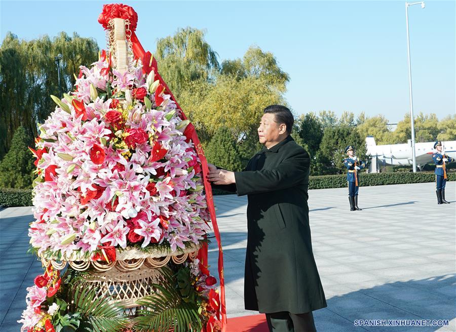 El presidente chino, Xi Jinping, también secretario general del Comité Central del Partido Comunista de China (PCCh) y presidente de la Comisión Militar Central (CMC), coloca una ofrenda floral a los héroes fallecidos de la Fuerza Aérea del Ejército Popular de Liberación (EPL) en el Museo de Aviación de China en el distrito Changping, Beijing, capital de China, el 8 de noviembre de 2019. Xi asistió el viernes a un evento con motivo del 70o aniversario de la fundación de la Fuerza Aérea del EPL en las afueras del norte de Beijing. En nombre del Comité Central del PCCh y la CMC, Xi envió felicitaciones por el aniversario de la fundación de la fuerza aérea y saludos a todo su personal de servicio. (Xinhua/Li Gang)