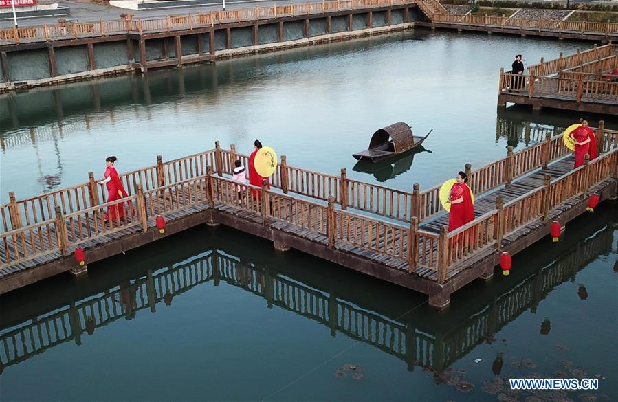 Varias aldeanas que hacen de modelos caminan sobre una pasarela de madera en un parque de la aldea Houtaizi de Qian'an, provincia de Hebei, el 10 de noviembre del 2019. El gobierno local ha hecho grandes esfuerzos para mejorar la vida en las zonas rurales este a?o. Después de una transformación y una construcción de alto nivel, un pozo de residuos se ha convertido en un hermoso parque con agua limpia y edificios antiguos, convirtiéndose en un lugar público atractivo para la recreación y el entretenimiento. (Xinhua / Jin Liangkuai)