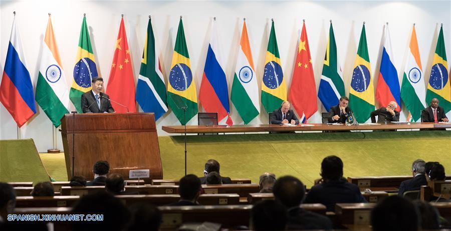 El presidente chino, Xi Jinping, habla durante el diálogo de líderes de BRICS con el Consejo Empresarial del BRICS y el Nuevo Banco de Desarrollo en Brasilia, Brasil, el 14 de noviembre de 2019. El diálogo de líderes de BRICS con el Consejo Empresarial del BRICS y el Nuevo Banco de Desarrollo se llevó a cabo el jueves en Brasilia. El presidente chino, Xi Jinping, el presidente brasile?o, Jair Bolsonaro, el presidente ruso, Vladimir Putin, el primer ministro indio, Narendra Modi, y el presidente sudafricano, Cyril Ramaphosa, asistieron también al diálogo. (Xinhua/Wang Ye)