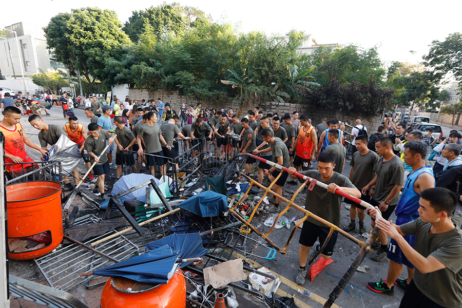 Oficiales y otros miembros del personal de la guarnición de Hong Kong del Ejército Popular de Liberación ayudan a despejar una calle al frente del Cuartel Kowloon. Este 16 de noviembre de 2019. Su operación ganó el aplauso de los residentes. [Foto: China Daily]