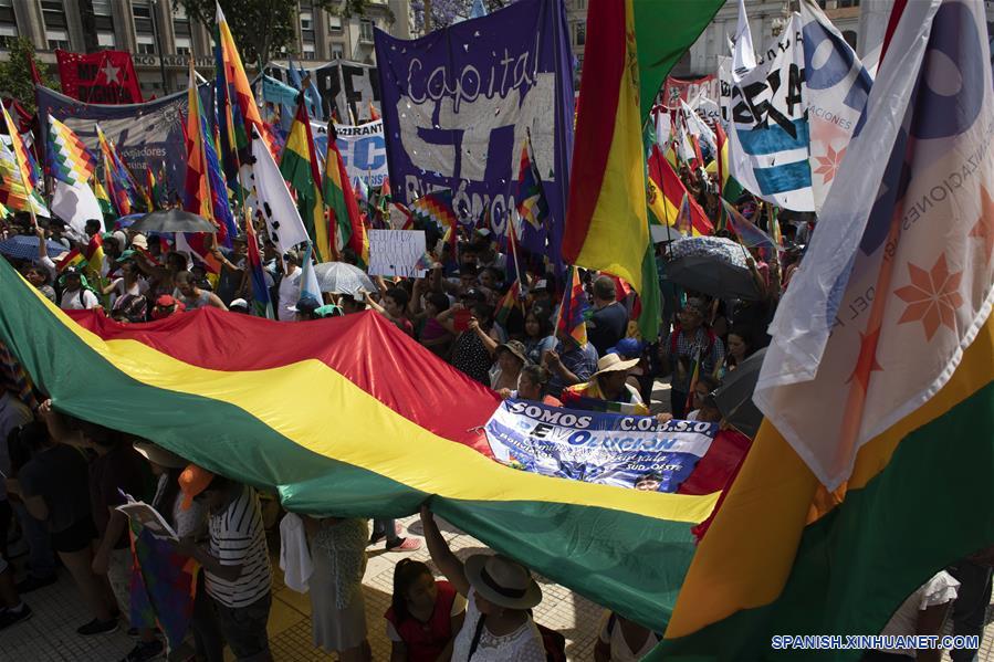 Personas participan en una marcha para repudiar el "golpe de Estado en Bolivia", en la Plaza de Mayo, en la ciudad de Buenos Aires, capital de Argentina, el 18 de noviembre de 2019. Organizaciones sociales, políticas y de derechos humanos marcharon el lunes en la Plaza de Mayo, donde además se realizó un festival artístico con la consigna "No al golpe de Estado en Bolivia". (Xinhua/Martín Zabala)