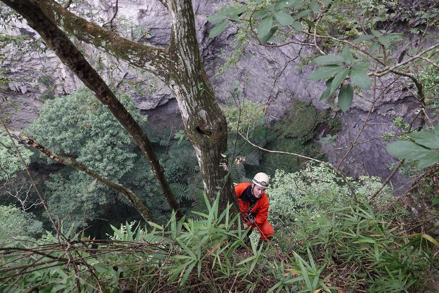 Un miembro de la expedición prepara el equipo antes de explorar el sumidero gigante de karst del condado de Napo, región autónoma de Guangxi Zhuang, 2 de noviembre del 2019