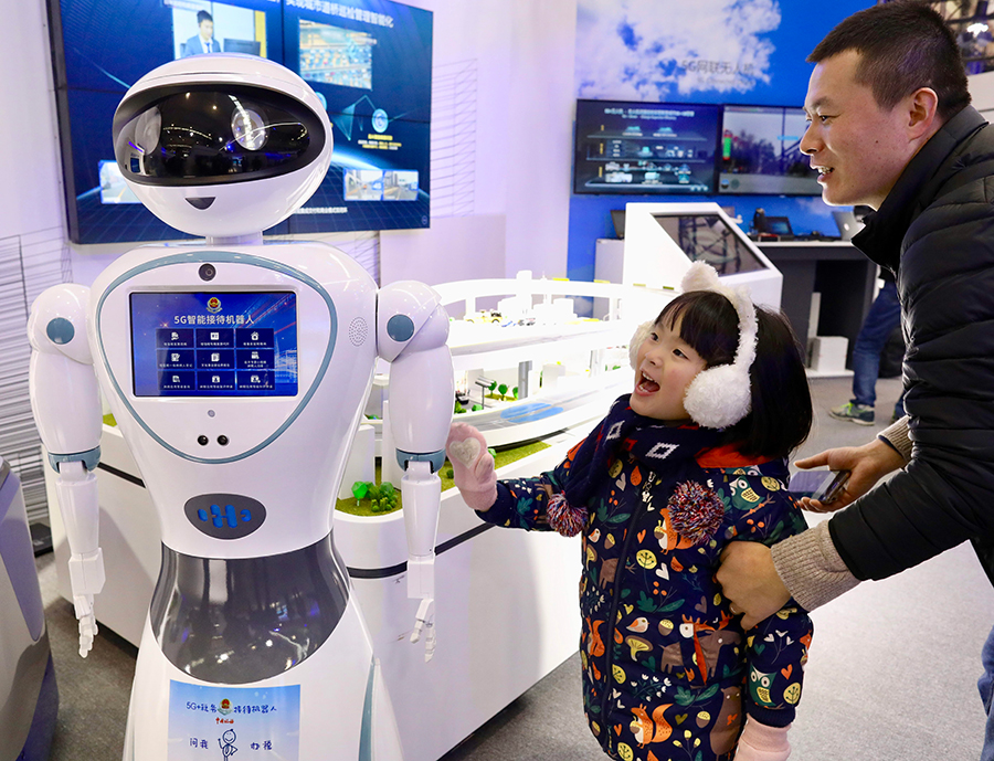 Los visitantes interactúan con un robot habilitado para 5G durante una exposición tecnológica en Beijing el 20 de noviembre de 2019. [Foto / China Daily por Zhu Xingxin]