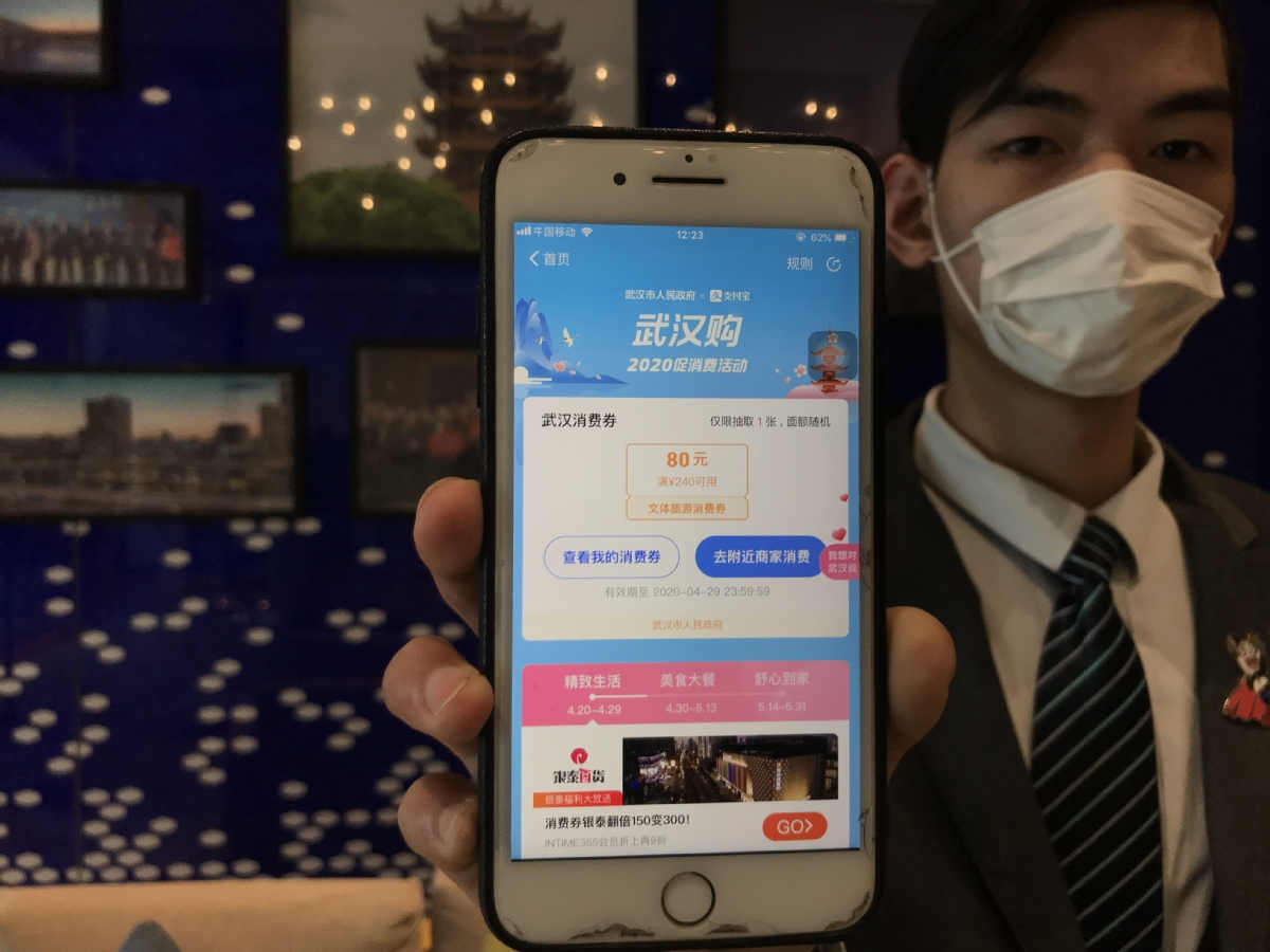 Un residente de Wuhan, provincia de Hubei, muestra un cupón que usó desde el teléfono, 19 de abril del 2020. [Foto: Wang Jing/ China Daily]
