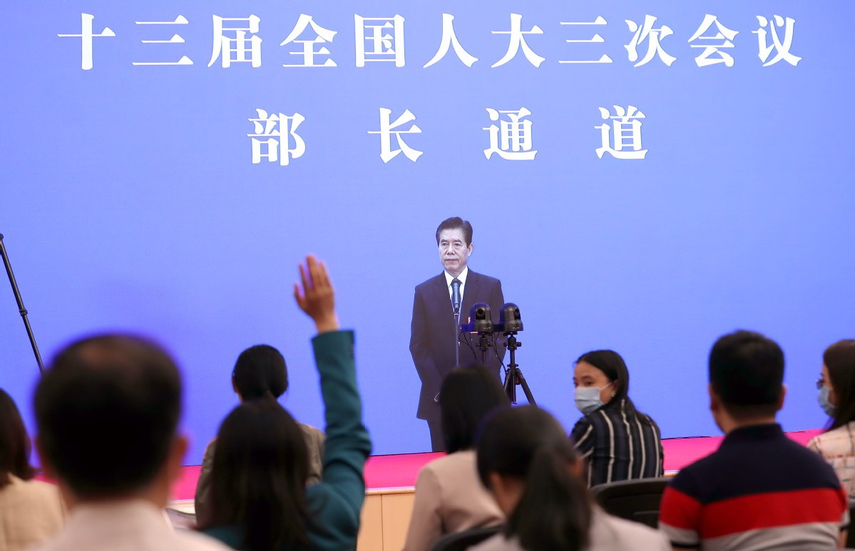 El ministro de Comercio, Zhong Shan, responde a las consultas de los periodistas en línea el lunes en Beijing al margen de las Dos Sesiones. (Foto: China Daily)