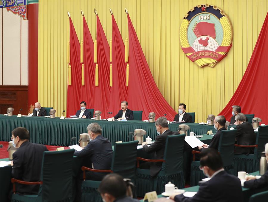 BEIJING, 26 mayo, 2020 (Xinhua) -- Wang Yang, miembro del Comité Permanente del Buró Político del Comité Central del Partido Comunista de China y presidente del Comité Nacional de la Conferencia Consultiva Política del Pueblo Chino (CCPPCh), preside una reunión sostenida por el consejo de presidentes del Comité Nacional de la CCPPCh en Beijing, capital de China, el 26 de mayo de 2020. (Xinhua/Ding Lin)