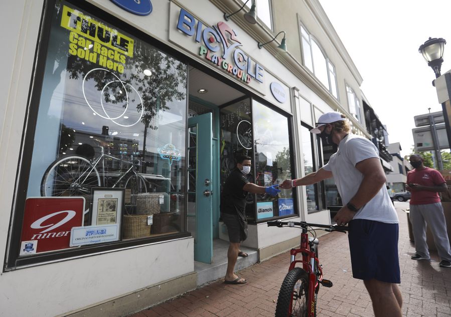 Imagen del 27 de mayo de 2020 del empleado de una tienda de bicicletas (i) recibiendo la tarjeta de crédito de un cliente después de vender una bicicleta nueva bajo la modalidad de entrega en la acera, en el condado de Suffolk de Long Island, en el estado de Nueva York, Estados Unidos. (Xinhua/Wang Ying)