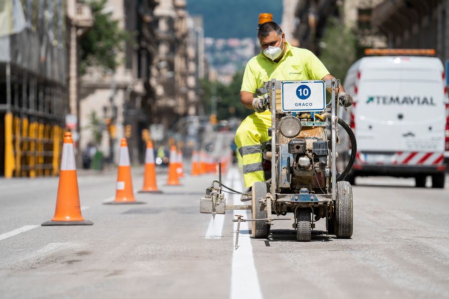 Imagen del 19 de mayo de 2020 de un operador modificando la circulación de vehículos para ampliar las aceras y garantizar el distanciamiento social de los peatones, en Barcelona, Espa?a. (Xinhua/Ayuntamiento de Barcelona)